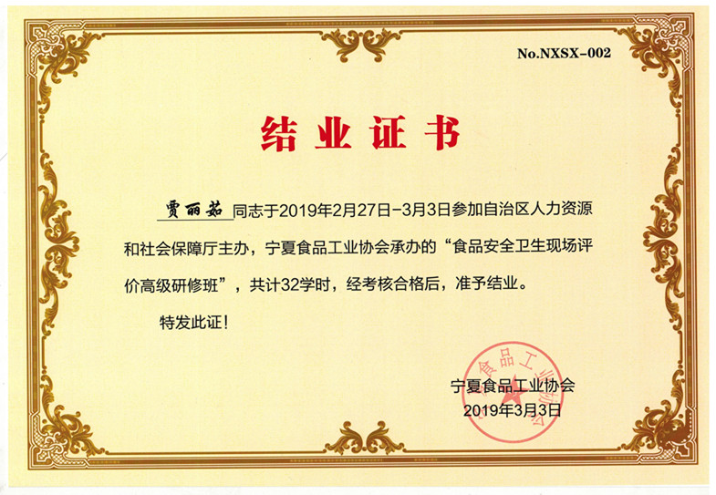 寧夏食品安全協會培訓結業考核證書