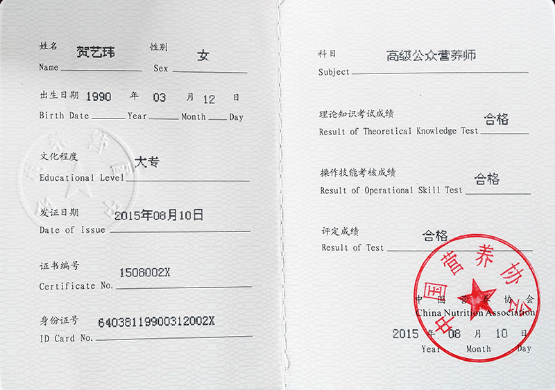 賀藝瑋獲得高級(jí)公眾營(yíng)養(yǎng)師資格