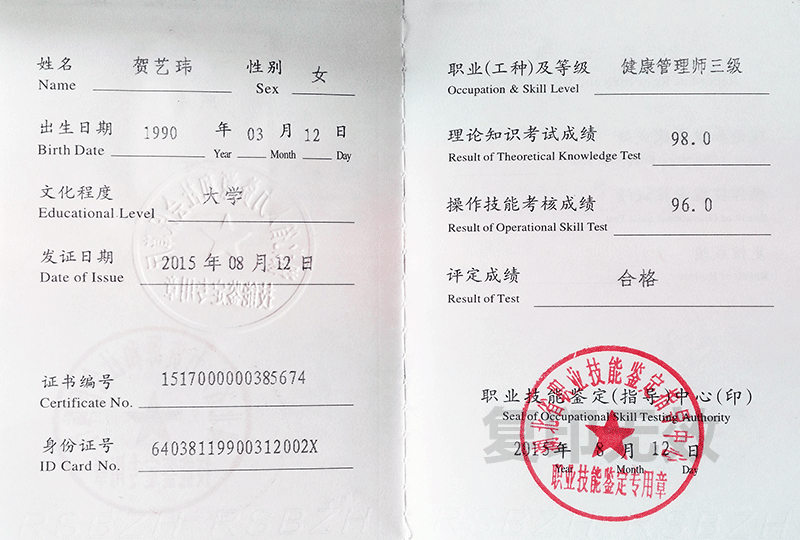 4賀藝瑋獲得高級健康管理師資格