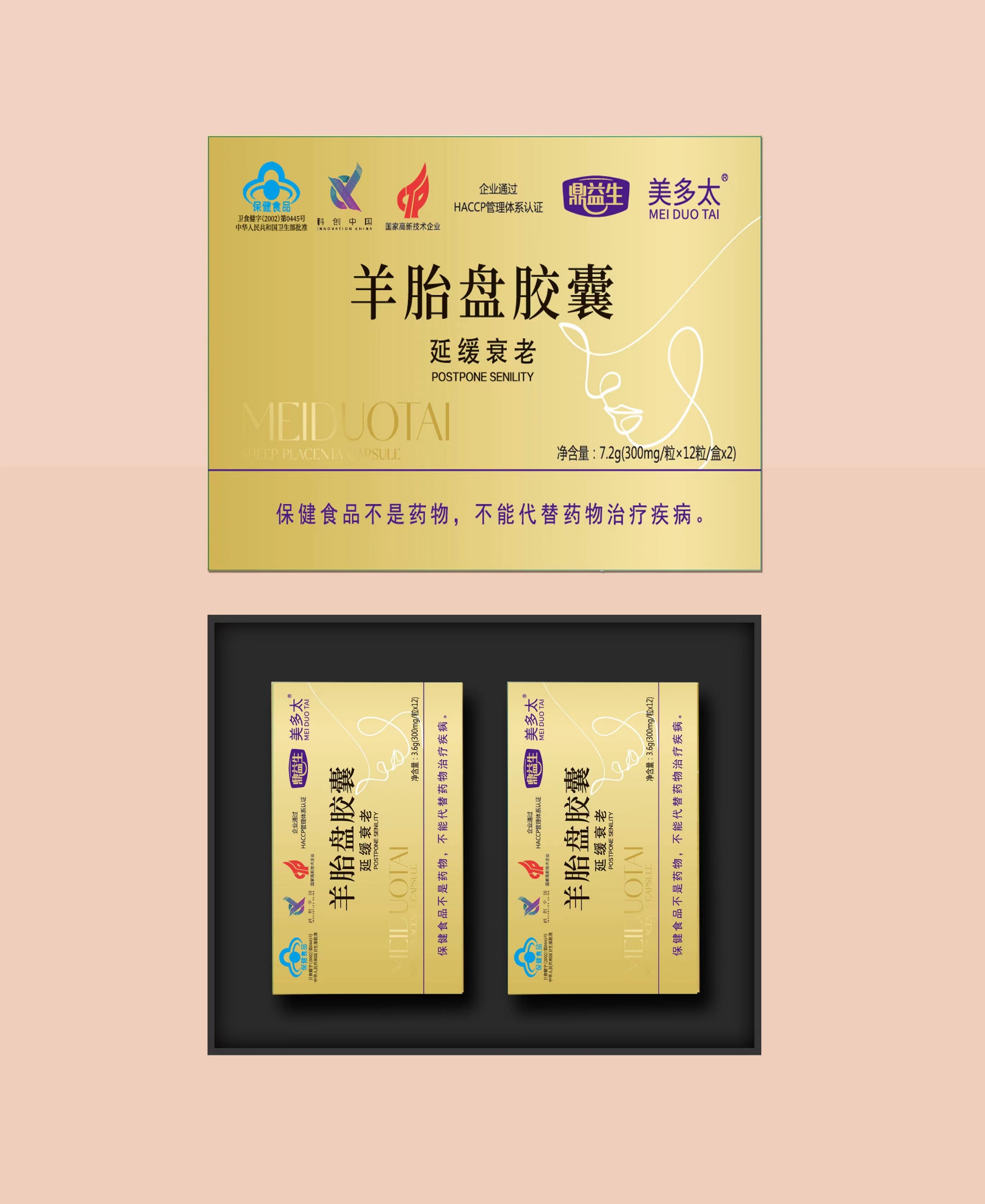 本品是以羊胎盤、淫羊藿、菊花、紅花為主要原料制成的保健食品,經(jīng)功能試驗(yàn)證明,具有延緩衰老的保健功能。